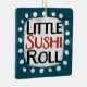 A cute typographic food design that says "Little Sushi Roll". It's black and red text on a white rectangle with funky, playful white dots surrounding it, all on a teal background.