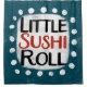 A cute typographic food design that says "Little Sushi Roll". It's black and red text on a white rectangle with funky, playful white dots surrounding it, all on a teal background.