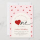Our little sweetheart 1st birthday invitation. Perfect for a heart theme birthday celebration. Cute girly design in red and blush pink. Features trendy modern typography script font. Simple minimalist elegant first girls bday celebration with a touch of boho chic. Personalize with your own details. Printed Zazzle invitations and/or instant download digital printable template.