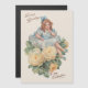 Pretty little Victorian girl in frilly white frock with blue sash and bow sitting among yellow roses with Valentine greeting text.