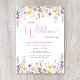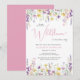 An elegant whimsical baby girl shower invitation featuring "a little wildflower is on her way" written in a mixture of modern grey typography and a stylish pink script, and boho-inspired watercolors of dainty purple, pink and yellow wildflowers. Personalize the mother's name and shower details in simple grey and pink lettering.