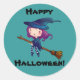 A set of Halloween stickers, wishing you a Happy halloween and featuring a little cartoon witch flying on a broomstick. She is wearing a big blue hat, a ripped dress and stripy socks.