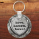 Those famous three words: "Live, Laugh, Love," in bold black text on a smooth silver printed 3d look metal heart which is on a shimmering, glittering sequins look background. An inspirational, great saying to live by. Nice for weddings, silver 25th anniversaries, valentine's day, new year's and birthday parties,etc. A lovely, fun and unique key chain for yourself or as a gift for that someone special.