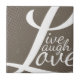 Live Laugh Love inspirational design. Typographic montage of the words "Live, Laugh, Love." over a brown grunge textured, halftone accented background.