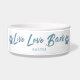 Cute pet bowl for your dog! The text says "love love bark" in a font with hand written like brush strokes. There are paw prints on both sides. Your puppy's name can be added at the bottom. It is in pretty dusty blue colour.