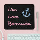 Shows the phrase "Live Love Bermuda" in a script or hand-printed-style in pink text and a blue boat anchor. Black background.