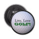 This round bottle opener has an image of a white golf ball on black background with text that says, "Live, Love, GOLF!" on it in black and green lettering. It would make a fun addition to the golf bag, man cave, den, or rec room and makes a great gift for the avid golfer.