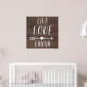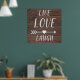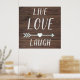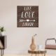 Printed Live Love Laugh sign on a rustic wood background with a heart and arrow.