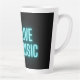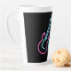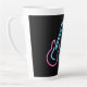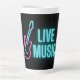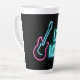 Fun latte mug features "Live Music" aqua neon text with a pink and aqua guitar outline on black background.