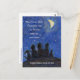 The postcard message notes, "When we are apart, I remember that we all live under the same moon. Long distance hugs to you". The art shows the shadows of three humans, a dog, and a cat gazing up at a crescent moon under a star-filled sky. Art was made using acrylic washes followed by pastel on paper.