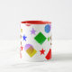 The cheerful personalized coffee mug boasts a vibrant and lively geometric design featuring stars, squares, and circles in bright colors such as golden yellow, red, green, blue, pink, and purple. This custom mug offers the option to personalize it with an initial or other text in a striking golden yellow. Whether you choose to keep the classic red mug or switch to green, blue, or black, it is sure to brighten your coffee or milk-drinking moments! A delightful choice for both kids and adults, this fun mug adds a touch of joy to any beverage.