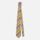 Colorful striped necktie designed with various shades of yellows, orange, greens, lavender and blue.