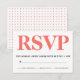 Living coral and white typography geometric wedding RSVP response card. The back includes a coral and white geometric pattern.