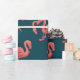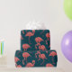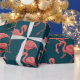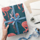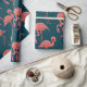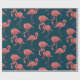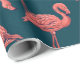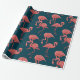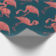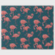 Vector pattern with hand drawn flamingos in living coral colour on dark blue background.