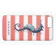 Dress you new phone with this preppy chic striped case featuring a blue illustration of a vintage seahorse in blue over a nautical stripes in feminine coral pink colour.