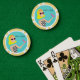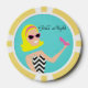 The woman on these customizable Living Doll Poker Chips knows who she is and she's okay with that. The design features a turquoise background and a drawing of a mid century modern cartoon woman with flippy blonde hair, a pink headband and pink sunglasses. Her white teeth are simply dazzling, as is her black and white chevron top. She is holding a bright pink shoe in one hand. As shown, the poker says, "Girls' Night." If you wish to change the text, simply click on the "Customize It" icon and replace the existing text with your own.