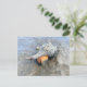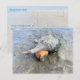 Florida wild sea snail photography postcard. A living horse conch seashell, with orange snail inside, is on the mud left at low tide. A lucky find while boating the saltwater river, this large mollusk is the state shell of Florida. This shell is not very pretty, with barnacles on it, but it is typical of what we see in the wild. Add a message to the back of the card, which has a beach scene background.