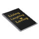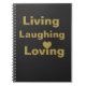 Inspirational “Living, Laughing and Loving” black and gold spiral notebook. The black background colour can be changed by the customer.