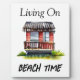 Wall art with a beach house with tropical plants watercolor style, with the funny quote, "Living on Beach Time." Ai art. generativecontent