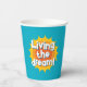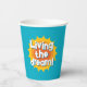 Living the dream! fun paper party cups for party. Cute design with inspirational quote. Vintage typography with red hot sun logo. Unique paper cups for BBQ, celebration, retirement and more.
