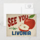 A charming Livonia Michigan vintage travel postcard featuring a lovely red apple, along with fun retro style text that says, "See you in Livonia"