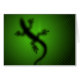 A small lizard is silhouetted against a green leaf. A bright light shines from behind. Computer art by Kathie Miller.