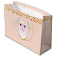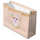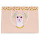 Beautiful gift bag with a llama and golden polka dots on pink background.