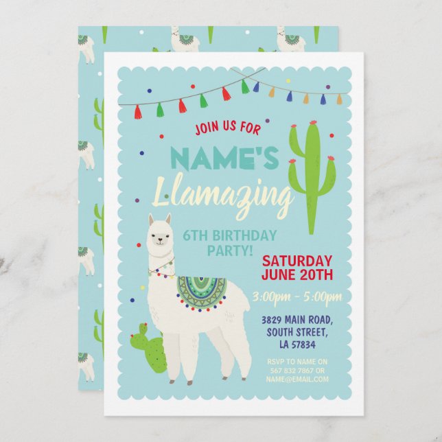 Llama Birthday Tassels Party Invitation. Perfect for any age. Simply change the text to suit your party. Back print included.