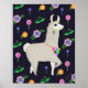 A fluffy llama, draped in a vibrant yarn collar, poses against a deep onyx backdrop adorned with a pattern of lively flowers in shades of orange, pink, blue, and green. Original artwork by Noël Snow.