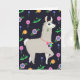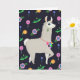 A fluffy llama, draped in a vibrant yarn collar, poses against a deep onyx backdrop adorned with a pattern of lively flowers in shades of orange, pink, blue, and green. Original artwork by Noël Snow.