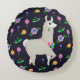 A fluffy llama, draped in a vibrant yarn collar, poses against a deep onyx backdrop adorned with a pattern of lively flowers in shades of orange, pink, blue, and green. This delightful pillow brings a playful and cheerful touch to any room.