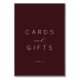 This elegant tabletop sign features a sophisticated maroon background with the words "CARDS and GIFTS" in an understated, modern typography. The minimalist design exudes a refined and timeless charm, perfect for adding a touch of class to your wedding reception decor. The phrase "thank you" at the bottom adds a heartfelt note of gratitude, making it ideal for expressing appreciation to guests. Its simple yet stylish aesthetic ensures it complements any wedding theme while maintaining a focus on grace and subtlety.