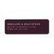 This elegant return address label design features a sophisticated maroon background with clean, classic typography that exudes timeless charm. The minimalist style focuses on simplicity and refinement, making it perfect for wedding stationery or formal correspondence. With its understated elegance, this design conveys a sense of grace and poise, ideal for those who appreciate subtle sophistication in their invitations and personal touches. Customize the text to personalize your special moments with an air of class and distinction.