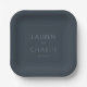 This elegant design features a minimalist and sophisticated style, perfect for a wedding celebration. The clean typography is simple yet refined, complementing the dark gray color palette that exudes modernity and grace. Surrounding elements like delicate ribbons and soft flowers enhance the romantic ambiance, making it ideal for an intimate and stylish event. Whether used on plates or invitations, this design captures a timeless elegance suitable for couples looking to create a memorable and chic atmosphere.