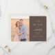 This elegant wedding save the date design features a warm, romantic photo set against a soft, earthy backdrop. The layout combines a tender moment captured in the photograph with sophisticated typography on a rich brown panel, creating an inviting and timeless feel. Perfect for couples looking to announce their special day with grace and charm, this design exudes warmth and love, setting the tone for a memorable celebration. Customisable text areas allow you to personalise your message while maintaining the overall aesthetic appeal.