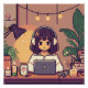 In this cosy 8-bit scene, a character sits at a desk with headphones on, immersed in their studies. Surrounded by indoor plants, books, and soft lighting, the ambiance is perfect for focused solitude. The lo-fi aesthetic adds a nostalgic and calming touch, making it an ideal setting for concentration and relaxation.