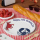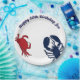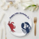 Lobster and crab paper plates with custom wording for any occasion. White plates come in two sizes and have navy blue text curved across the top. A single blue lobster and red crab decorate the plate. The red white and blue colours could be used for fourth of July.