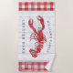 This coastal inspired design on this beach towel features a red lobster with your personalised name above and the words "Lobster Bake" below on a white and grey wood plank background. Bordering the top and bottom is red and white check.. Designed by world renowned artist ©Tim Coffey.