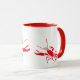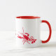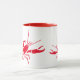 Coffee mug is shown in the classic white two-tone style with a cute red lobsters print.