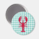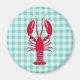 Fun kitchen magnet that goes with all sorts of coastal and summer decor themes!  Design features red lobster silhouette on blue gingham background