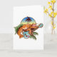 A funny cartoon illustration of a lobster on a tropical beach, playing a ukulele. A design fill with summer vibes for people who loves lobsters.