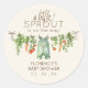 Celebrate your baby shower with our farmers market locally grown stickers, featuring charming watercolor illustrations of tomatoes, spinach, a tiny baby outfit, and carrots hanging from a washing line tied with bows. Make your gathering memorable.