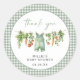 This locally grown themed baby shower round sticker features a baby clothes line graphic, a sage green gingham background and a modern font. It is perfect for a gender neutral farmer's market themed baby shower and you can pair it with anything in the MILLIE collection for a cohesive look.