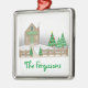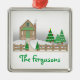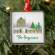 A Christmas ornament featuring a snow scene complete with a log cabind with green trim and a wooden fence.  Christmas trees to the right of the house.  Fence and porch decorated with red and green Christmas lights.  Personalise with your name in green at bottom.