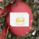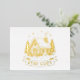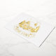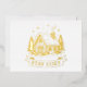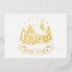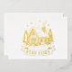A gorgeous gold foil design of a log house in the snow and text Stay Cozy" on the front of this card.