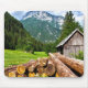 Featuring a no longer working logging camp, with aged logs laying in a pile, tucked down into a valley right beside a bright green forest.