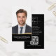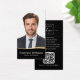 Modern, vertical, black and golden (printed colour gradient, not real foil) curved border business cards with your name and title on the front and customisable template fields for your contact information, logo and QR code on the back. You can change background and font colours, move and resize elements with the design tool.