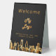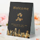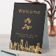A classic black background, golden coloured text. Decorated with a faux gold abstract city skyline. With the text: Welcome. Personalise and add your business logo and text. Delete the text if not wanted.