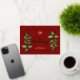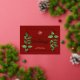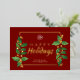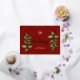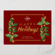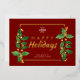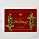 Classy modern horizontal happy holidays busines corporate both side print flat greeting card with a place for your logo featuring elegant classic watercolor christmas leaves and real gold foil pressed frame and happy holidays text on a classy burgundy red background, the modern design will give your clients the impression of luxury and success. The back side has custom wording. This Happy Holidays card template is ready for your online personalisation. The gold foil can be changed to rose gold or silver.