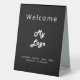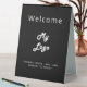 A classic black background, white coloured text. With the text: Welcome on the front and Closed on the back. Personalise and add your business logo and text.